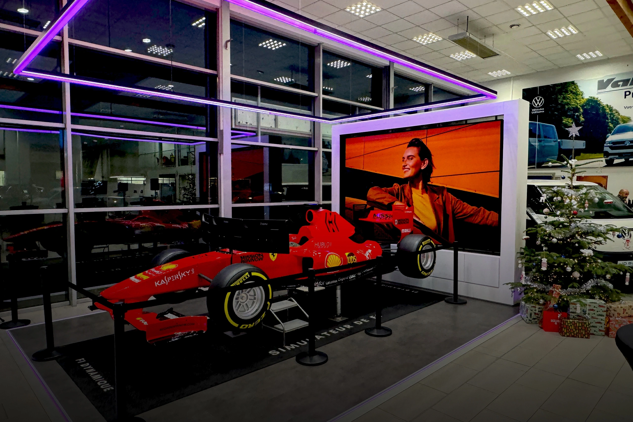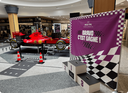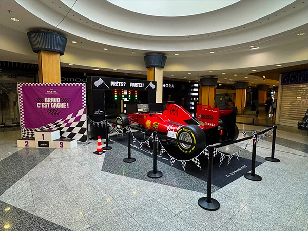 Pour dynamiser une galerie marchande, notre F1 à taille réelle attire l’œil et les amateurs de course automobile se pressent pour s’y essayer.